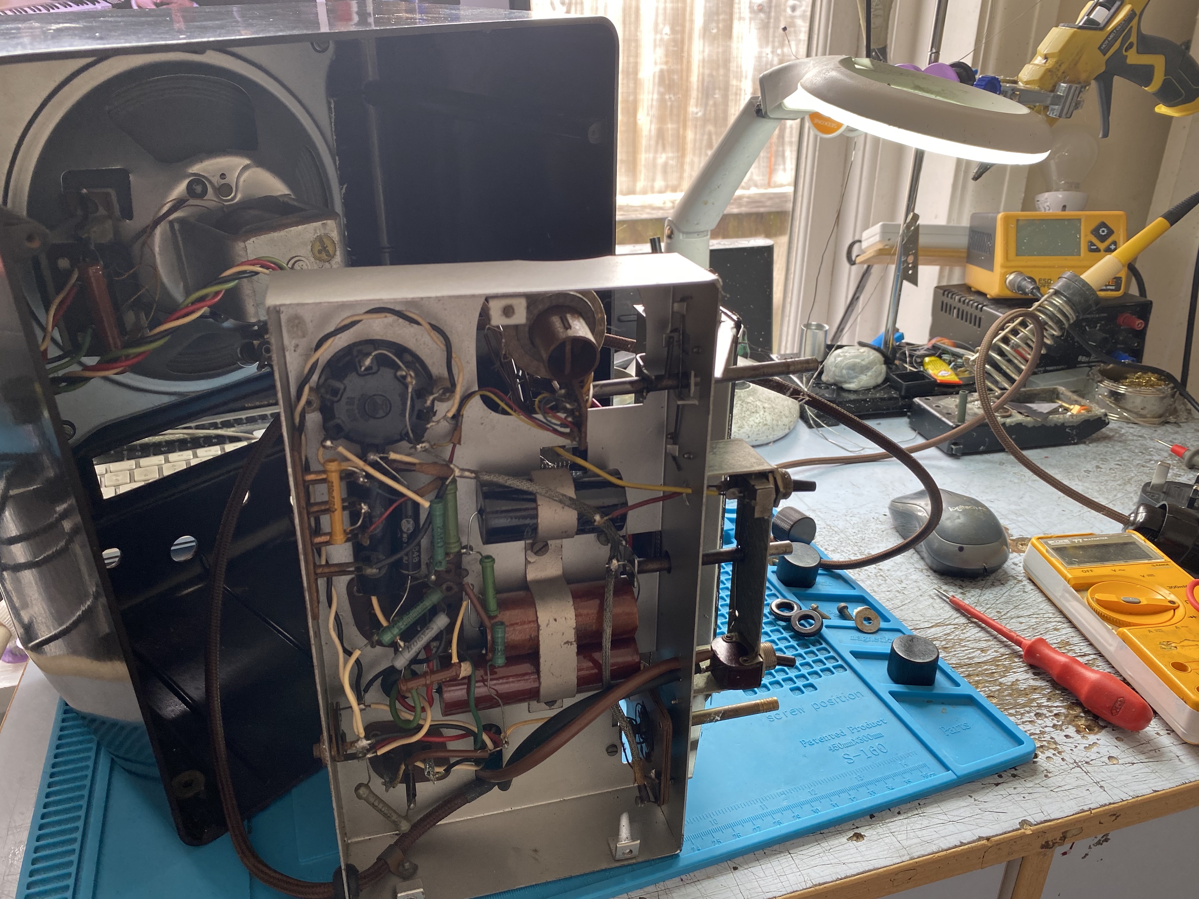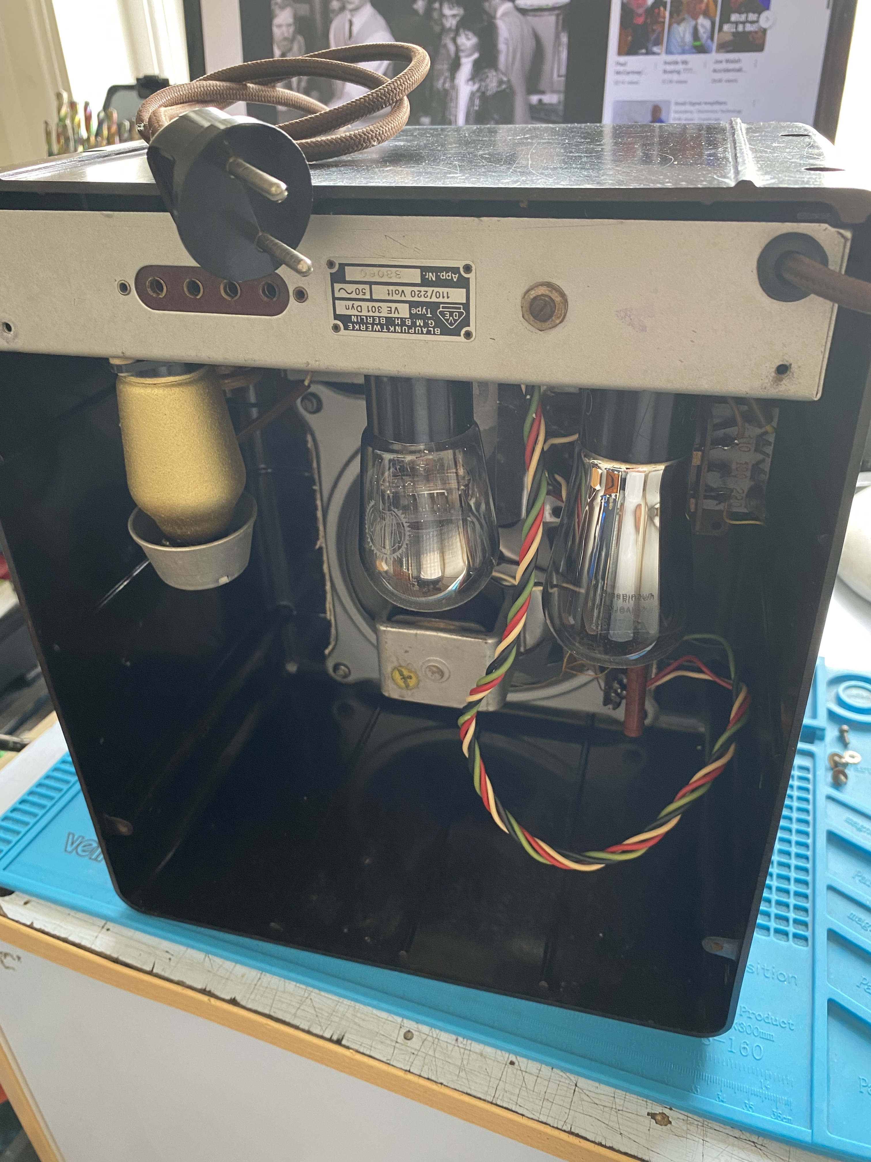 The radio came with a convertor for the mains plug. As Germany was on 220V 50Hz back then it's fine on our mains now. Here's the back removed for a "proper-gander" (Get it