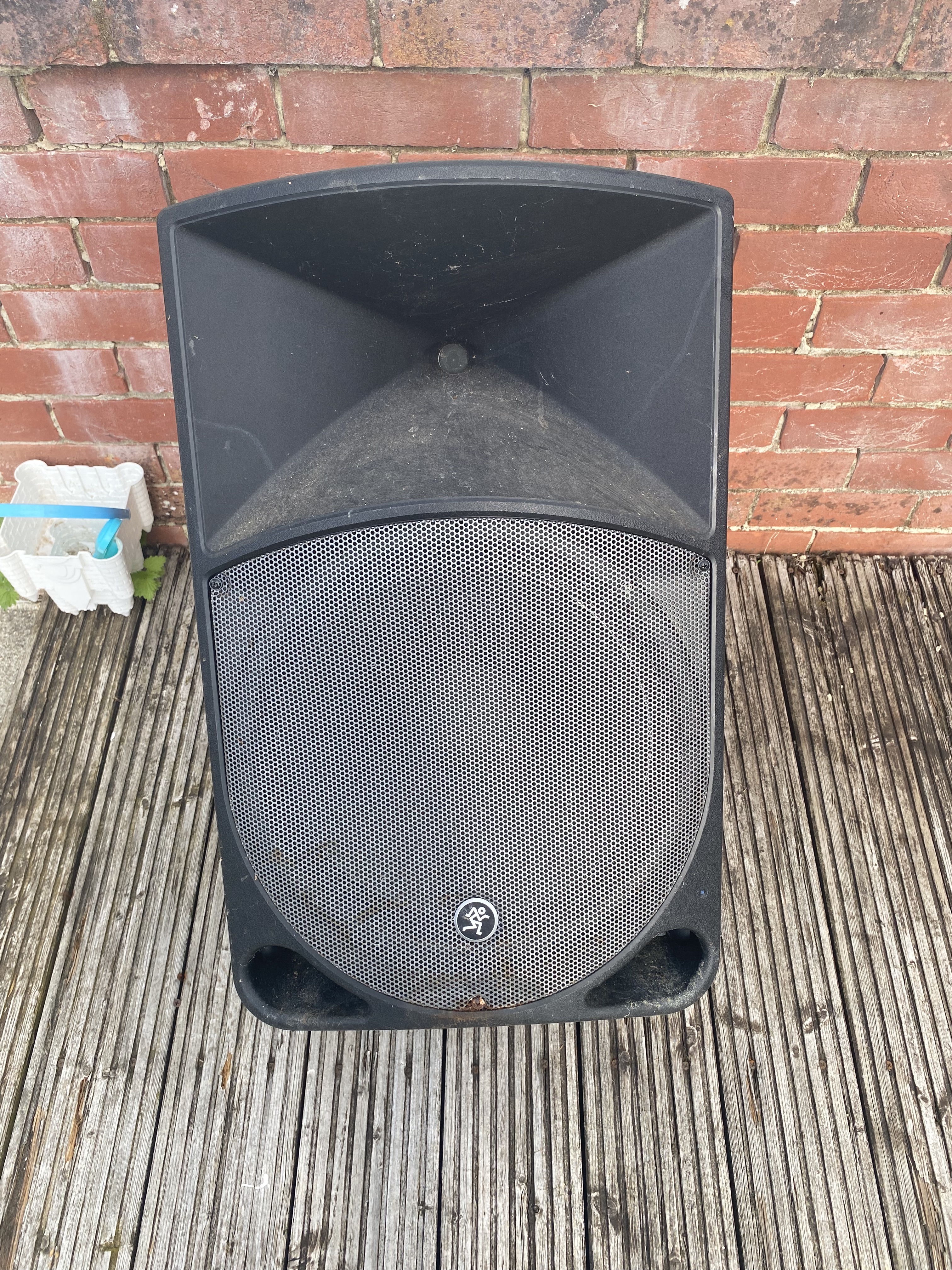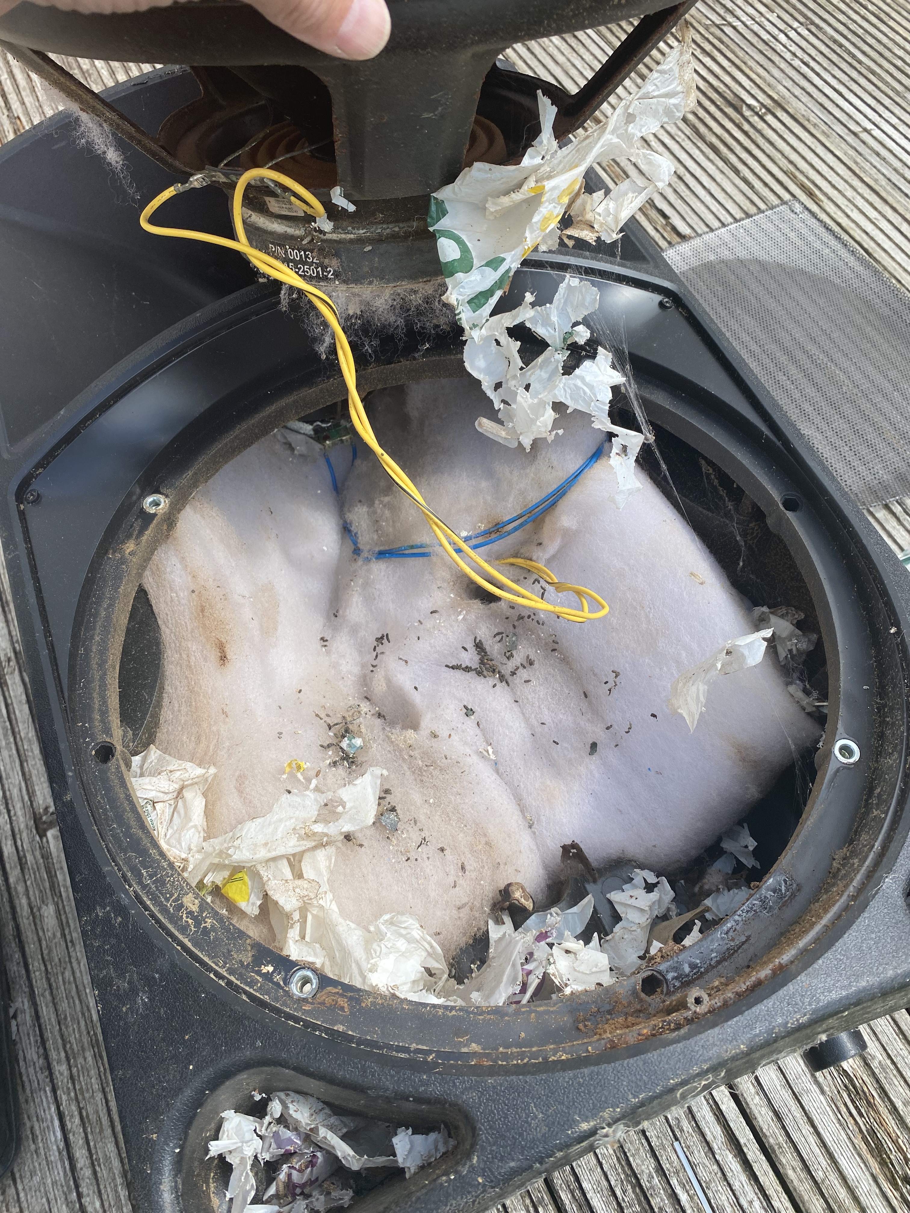 Well this was an odd repair. It's a set of Mackie speakers and the fault is ... there's a family of mice living in them. Or at least there was until recently. The speakers were stacked with one on top of the other in garage and with easy access through the front the mice saw them as a two story block of flats I guess.