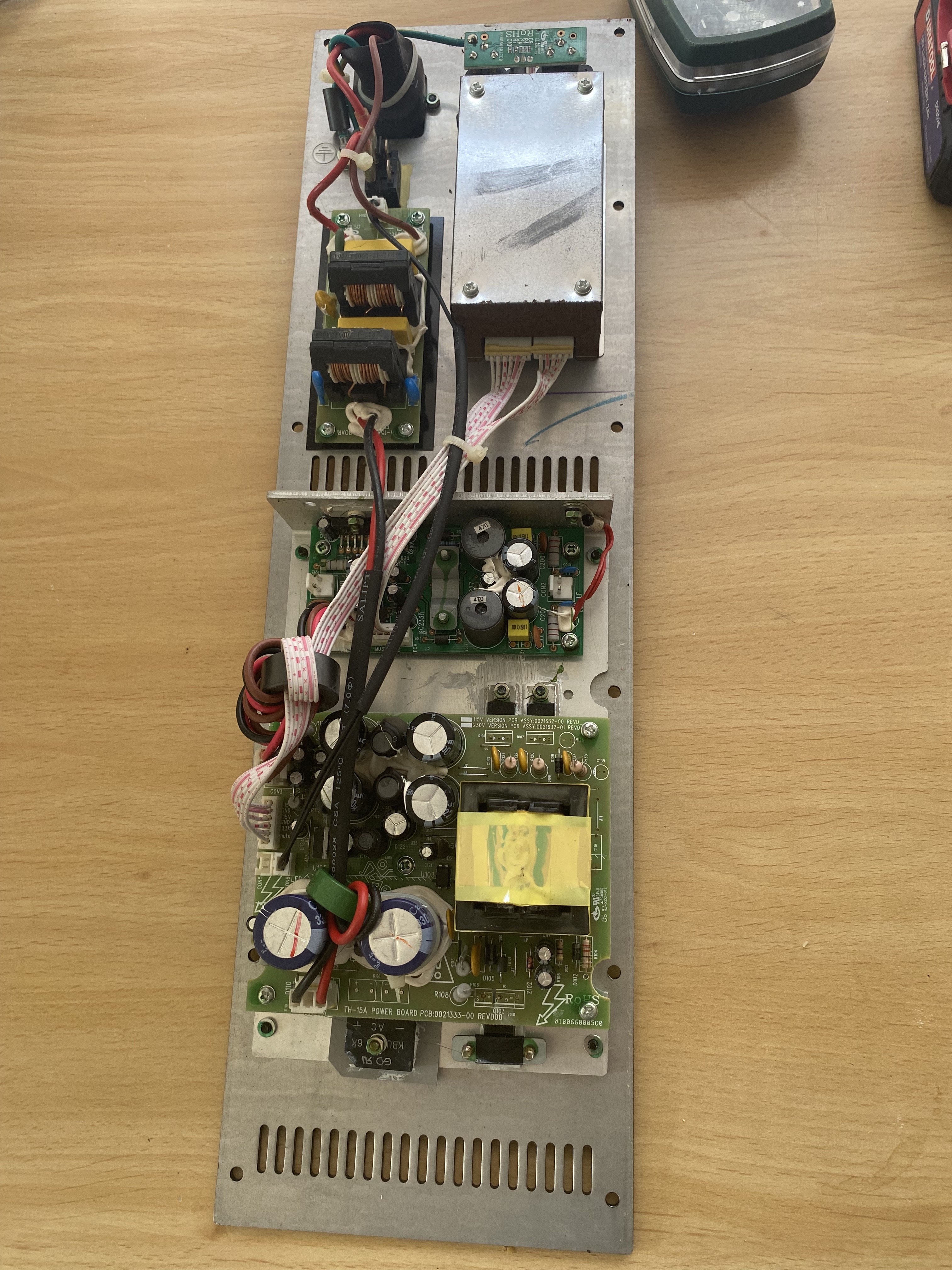 Coming in at the top we have the mains filter PCB to the left and the audio DSP board to the right. The board in the middle has a stereo TDA8924 class D IC amp bridged in mono to run the woofer ... it's under the clamp in the middle of the board. This chip is normally used in stereo and is 110 Watts or so a channel. Bridging it in mono to drive the one speaker will result in over double that so about 240 watts I reckon for the woofer. On the left is a traditional class A/B chip to run the horn, a TDA7294 which is 100 watts I think,