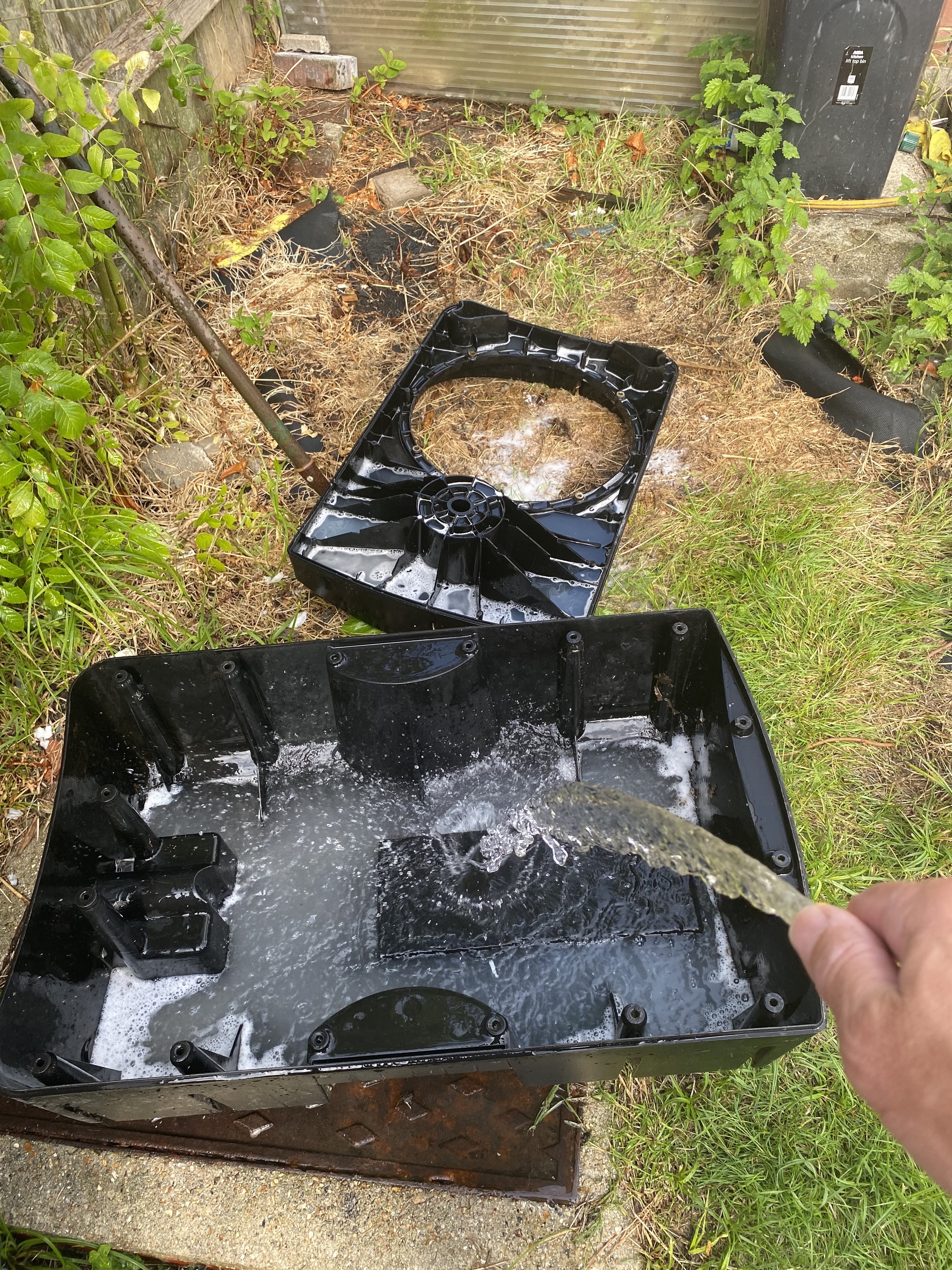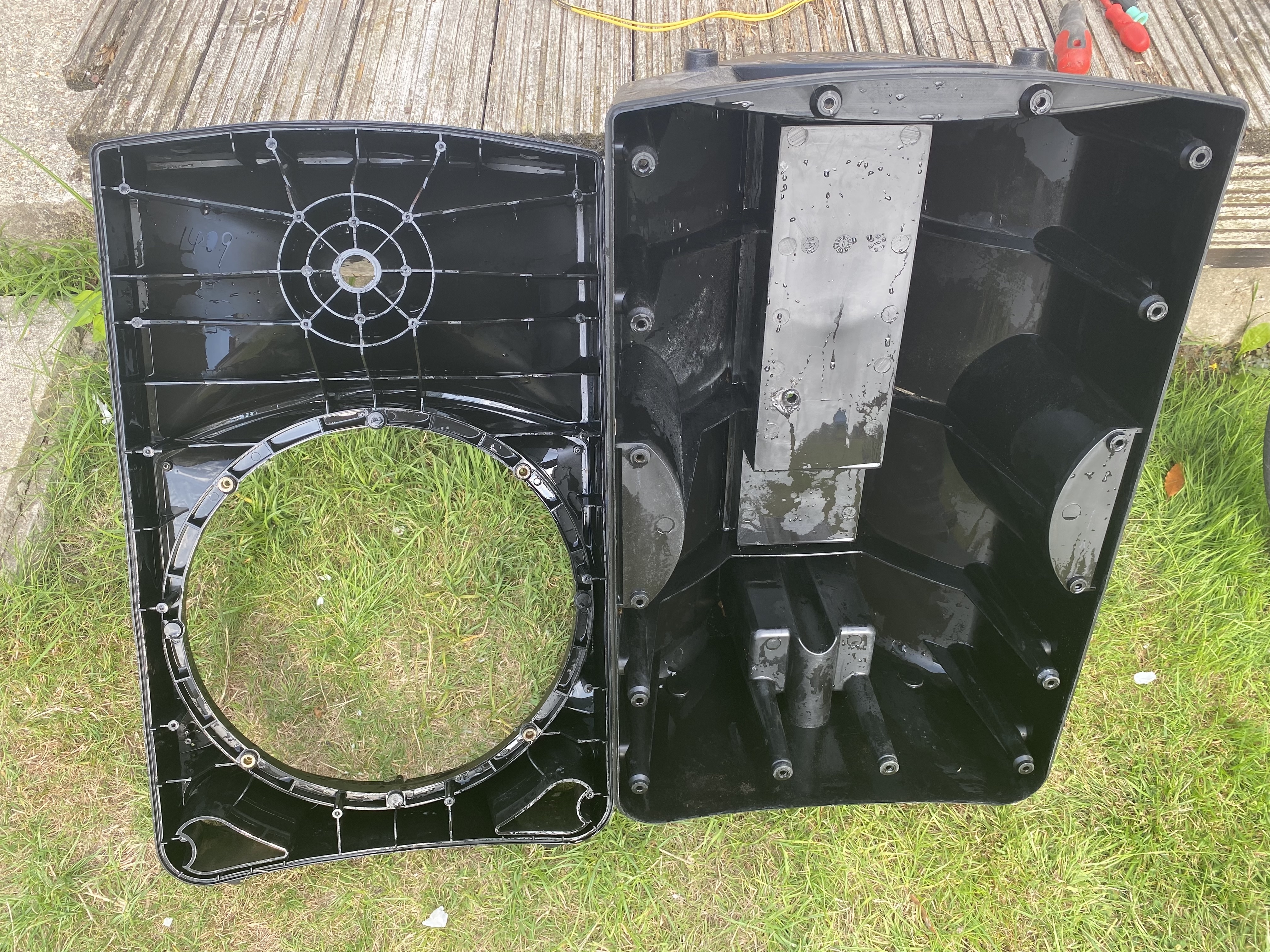 As bad as it looks though the drivers are ok and move freely with no fouling and the cabinets are made of plastic which is washable. So I remove every component and every speaker wire and part the 2 shells of the cabinet. Then get the hose on them after letting some bleached water sit in them for a while.