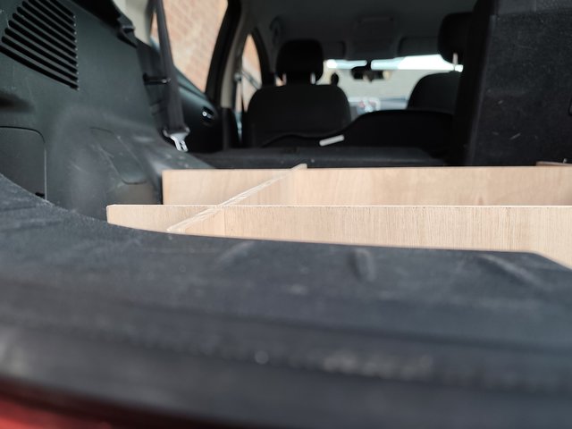 So, I have started building a raised floor which will make loading the PA much easier. And it'll be good for hiding the charging cables and other bits. The base consists of 4 pieces of hardwood ply, with slots that slide together without any fixings. You can just about tell from the 2nd image that it suits flush with the boot lip and the rear seats. There's a gradual slope so I'll need to be careful with anything that can roll out!