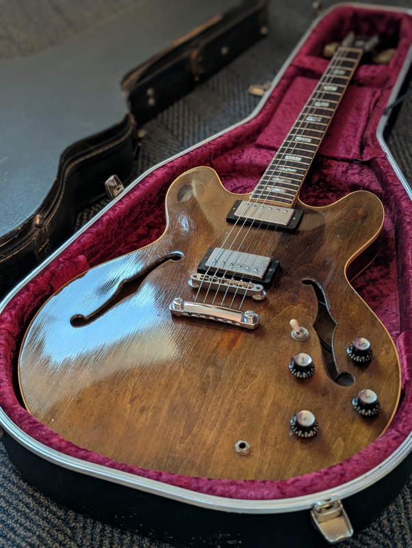 '69 Gibson 335This has been my favourite guitar for the last year I've owned it. I had it refretted and setup and also installed a Faber bridge as the original is a bit sunken in the middle. Of course it'll be included and it does work. Currently installed is a Lollar Imperial in the neck, and a hand wound PAF clone in the bridge that perfectly matches it. I have the original pickups which are fully functioning and are included. Pots are all original apart from the bridge volume pot which was a little stiff so I had my tech change it as it was a regular gigging guitar for me. Again, the original is included and works.