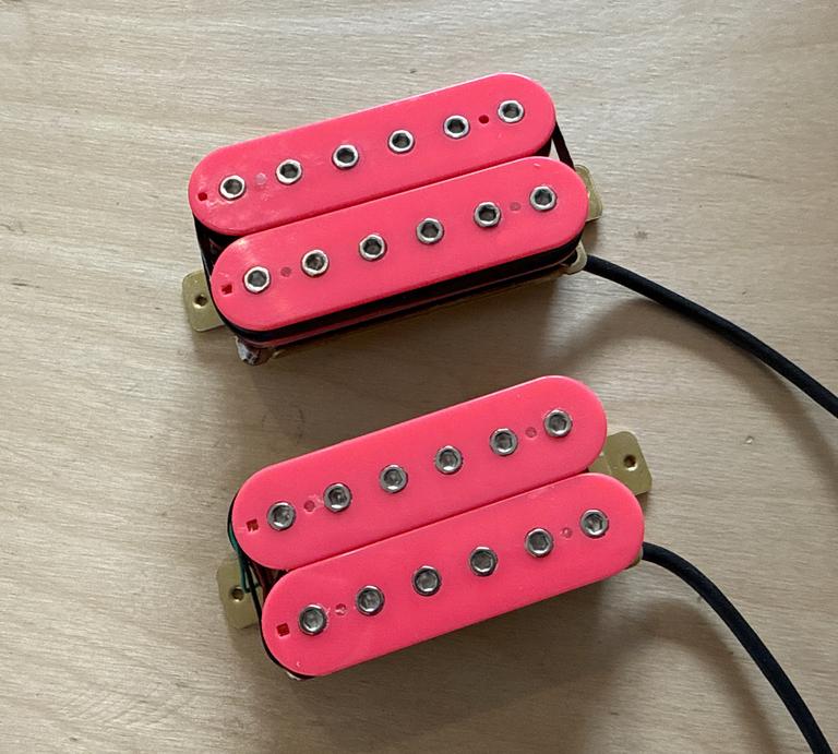 A Blue Streak Bridge in 52mm 4 conductor (basically an original Super Distortion style) plus a Scrapyard Dog alnico 5 PAF neck - four conductor 50mm both in hot pink. Get some hairspray and rock out ...
