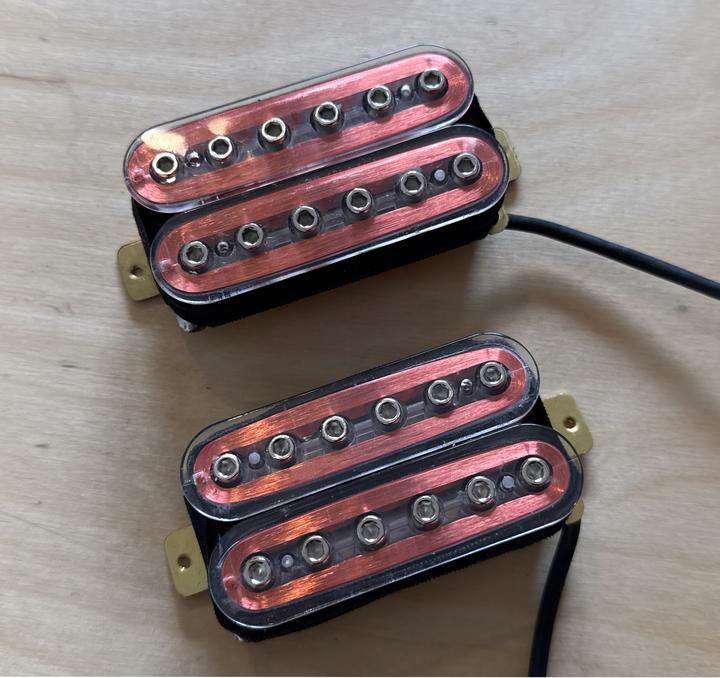 Bridge 16.8k ceramic 12.6 ceramic neck 52mm bridge 50mm neck, 4 conductor wired. Brass baseplates. in see-thru bobbins with scarlet wire! My Afterburner finish.